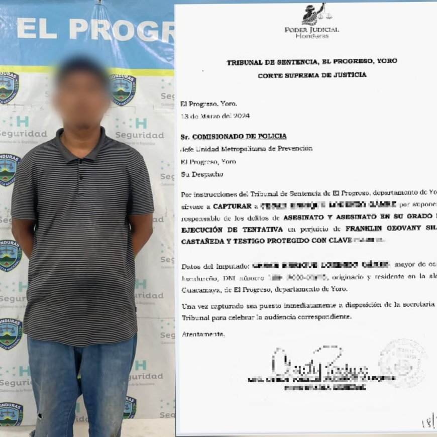 Sobre el imputado pende una orden de captura emitida por el Tribunal de Sentencia de El Progreso, Yoro, desde el 13 de marzo de 2024, por los delitos de asesinato y asesinato en su grado de ejecución de tentativa en perjuicio de Franklin Geovany Silez Castañeda y testigo protegido.