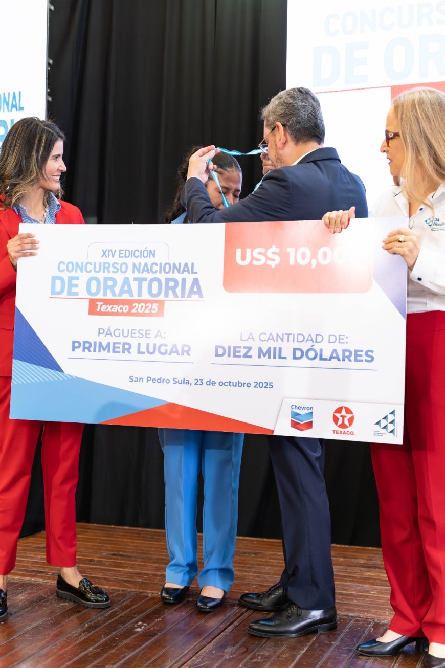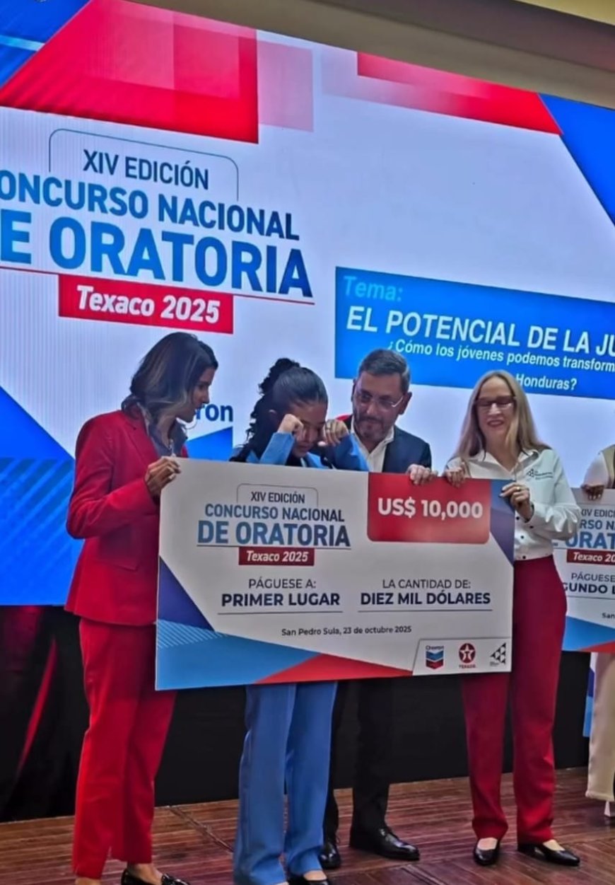 El premio nacional de oratoria, patrocinado por Junior Achievement Honduras y Chevron a través de su marca Texaco, fue otorgado a Isiñeni Christ Ocón Rivera, estudiante del instituto Eduardo Hernández Chévez de El Progreso, Yoro.